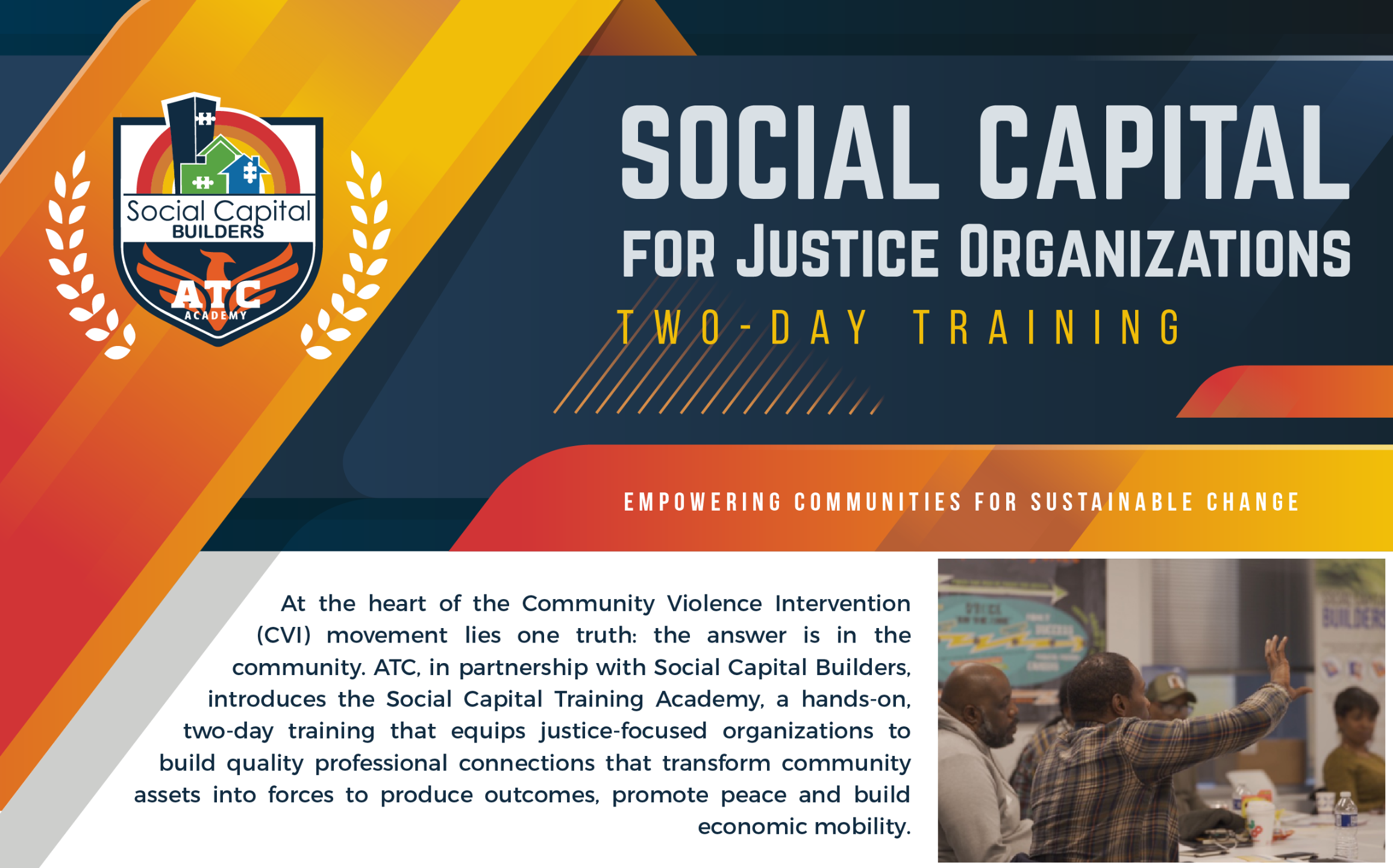 The Academy for Transformational Change has partnered with Social Capital Builders, the lead agency in social capital, to bring you a training experience rooted in connection driven impact. The Academy for Transformational Change welcomes you into a space built for people who are serious about creating real progress in their communities. ATC is designed to help professionals tap into the power of social capital, expand the networks around the people they serve, and strengthen the ties between systems, neighborhoods, and industry opportunity fields. This is where practical skill building meets a deeper commitment to connection driven change. As you move through ATC, you will learn tools that translate directly into better engagement, stronger coordination with partners, and more meaningful outcomes for the individuals and communities you support.